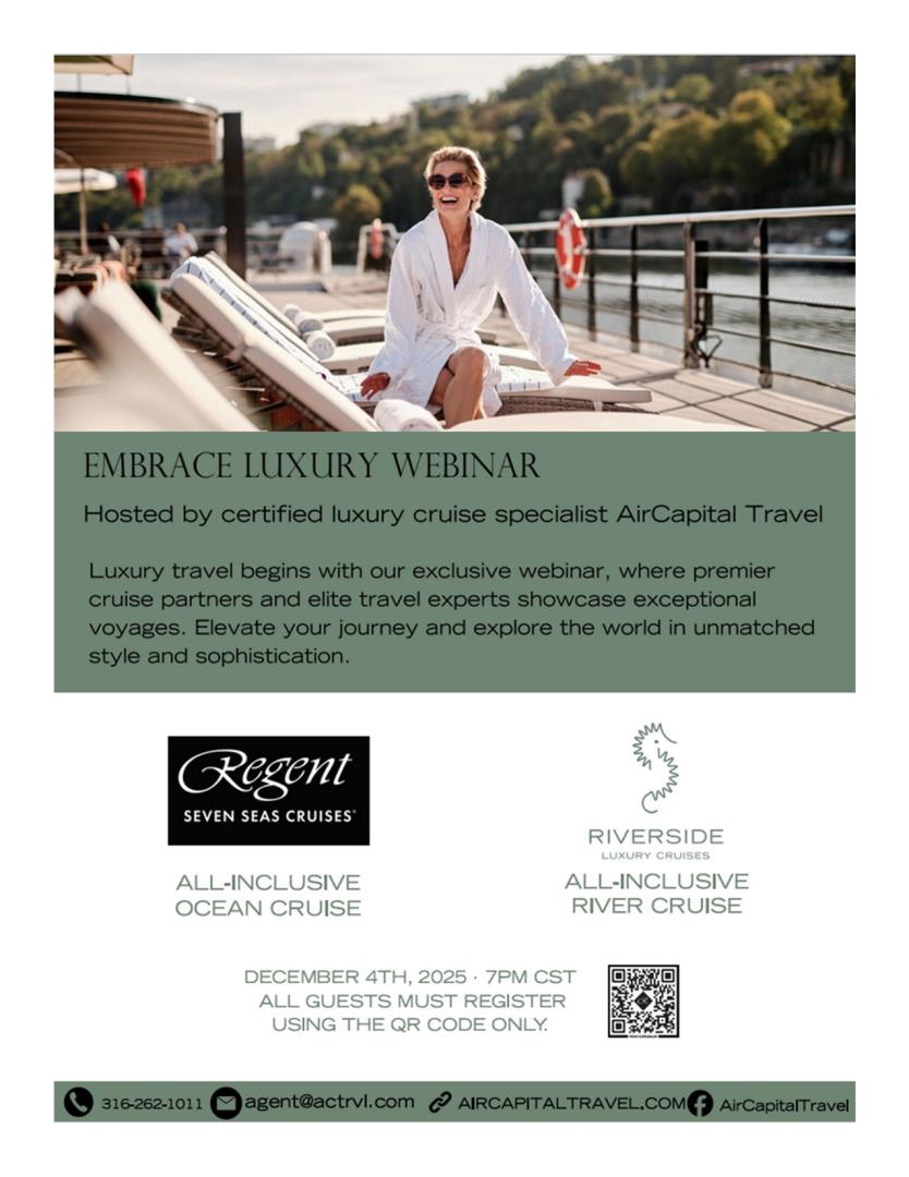Are you ready to embark on a journey of elegance and adventure? Air Capital Travel is excited to invite you to our upcoming webinar dedicated to the world of luxury cruises.